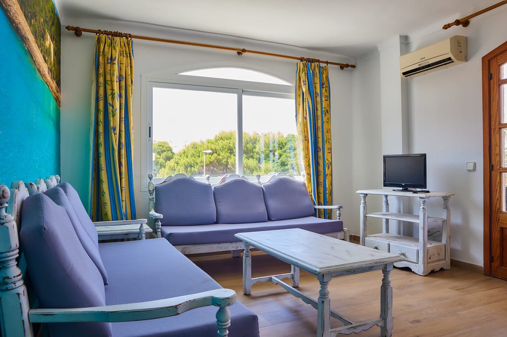 Habitación de hotel reformada y amueblada.